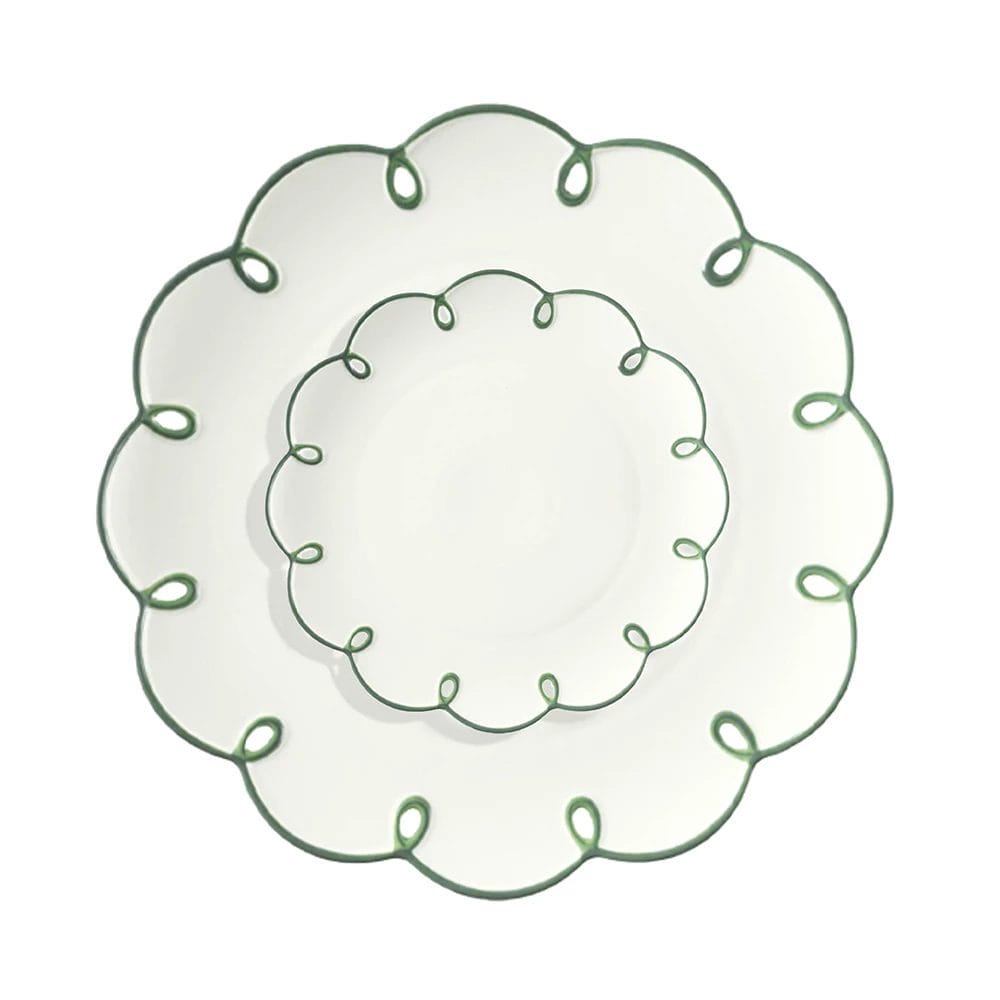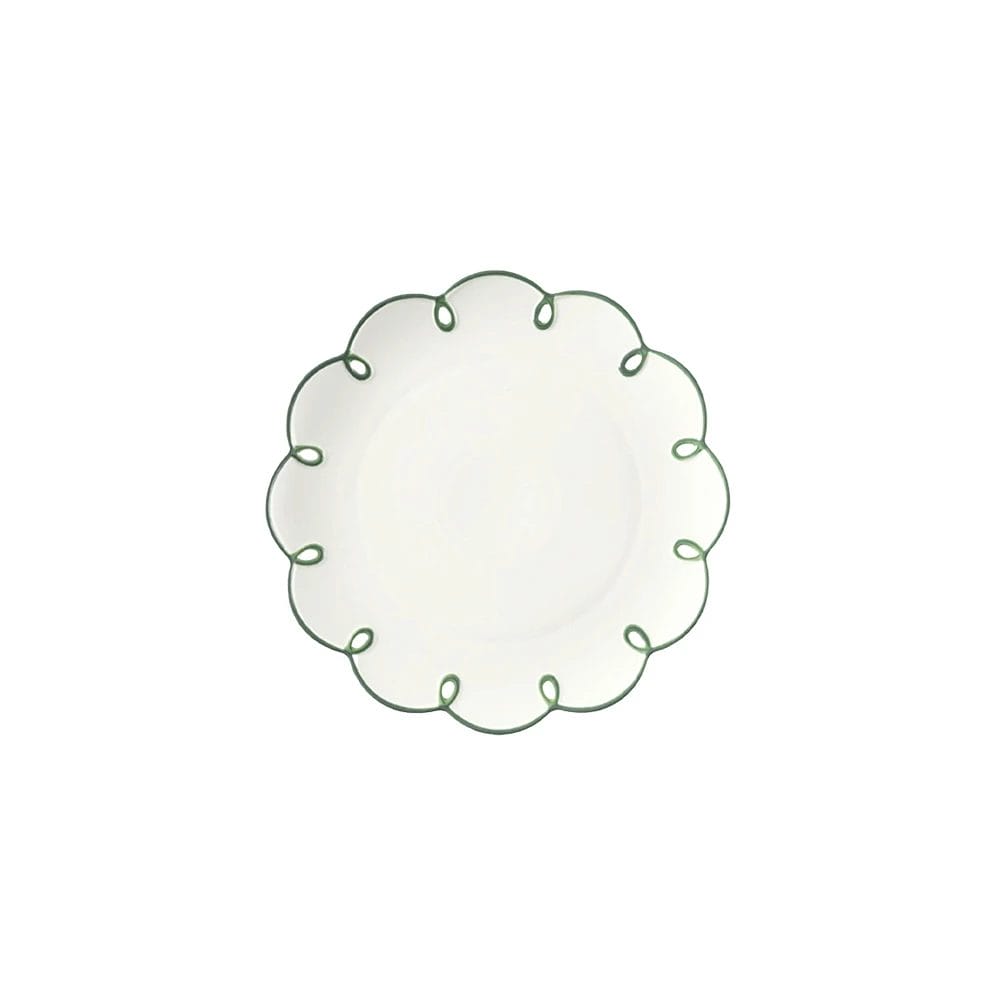 Piattino pane in ceramica bianca con bordo ondulato con profilo verde. Sottopiatto coordinato disponibile.